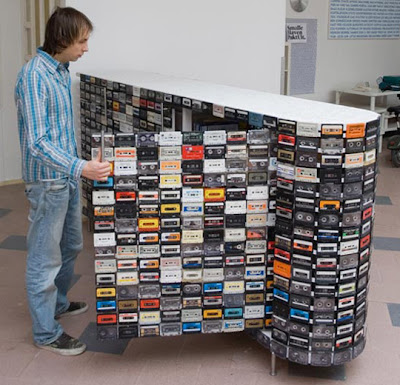 Ik ben waarschijnlijk één van de weinige mensen die nog daadwerkelijk cassetjes gebruikt (bij onze autoradio functioneert alleen nog het cassettedek, vandaar). Ok, die dingen slijten snel af, maar man, wat een ferme brok jeugdnostalgie hangt er daar niet aan vast! Nu, tegenwoordig zijn blanco audiocassettes héél moeilijk te vinden (I should know, ‘k heb ferm moeten zoeken), maar ik ben zeker dat er nog wel wat mensen er ergens in een stoffig hoekje op zolder liggen hebben. Nederlandse designer Patrick Schuur heeft er alvast iets prachtigs mee gemaakt. Maar hij heeft dan ook wel 918 stuks moeten vastschroeven op houten geraamtes om dit resultaat te krijgen. Wil je ook zo’n mooie kast, begin dan maar alvast te ronselen bij familie, vrienden en buren.