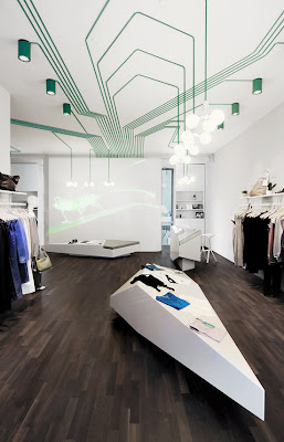 Veel winkelinterieurs houden het op strak en wit, zo ook bij boetiek ‘Maygreen’ in Hamburg, maar aan het plafond tref je toch een opvallend extraatje aan. Interieurarchitectenbureau KINZO zorgde namelijk voor verlichting die aan een computerchip doet denken. Het zit hem in de details.