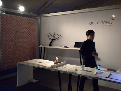 Simpel idee en misschien niet zo superzichtbaar vanop mijn amateuristische foto, maar de wand links was volledig opgetrokken uit ronde flyers van het design consultancy bureau Orcadesign. Mooi mooi mooi!