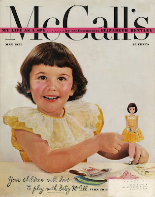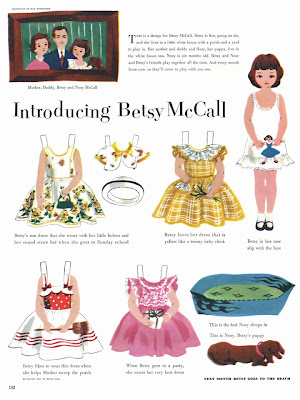 Vergeef het me, maar ik blijf nog even in poppemiesfeer. Tot voor een week had ik nog nooit van Betsy McCall gehoord, maar blijkbaar was Betsy een papieren poppetje dat je vanaf 1951 in het Amerikaanse damesblad McCall kon terugvinden. Dankzij haar populariteit volgde er al snel een echte pop, maar ik heb het toch meer voor de papieren versie. Lekker ouderwets. Ook grappig hoe de outfits van Betsy en moederlief matchen. Plus, let op de zalige strandjas!